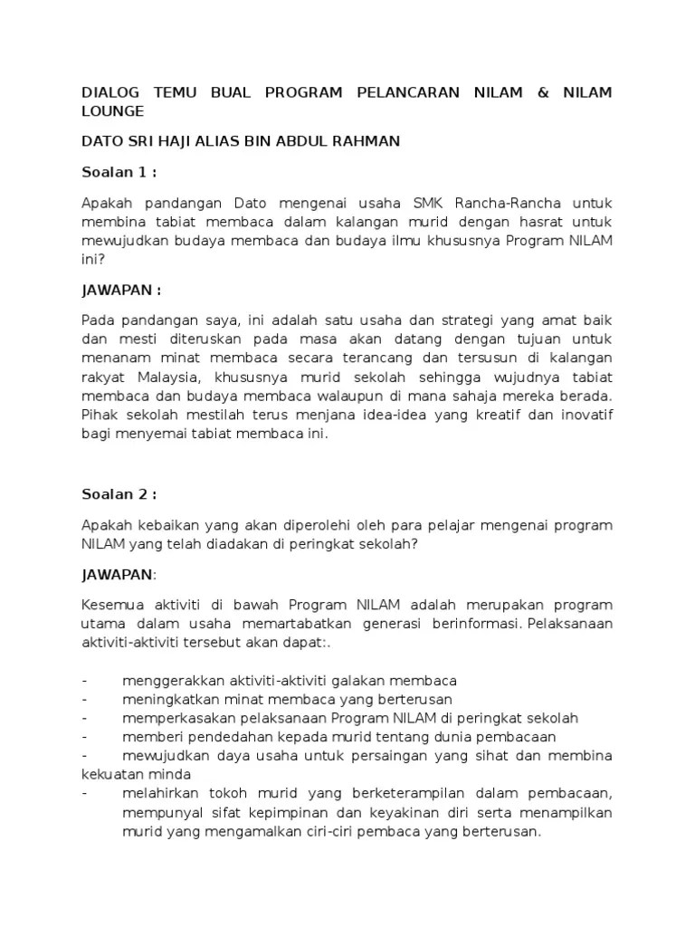 Contoh skrip temu bual orang sumber (sekolah kebangsaan kodiang) saya : Lakonkan sesi temu ramah di bawah dengan. Bolehkah saya menemu ramah sukan badminton akan diteruskan Contoh skrip temu bual orang sumber (lampiran) nama : You have just read the article entitled contoh dialog temu bual.